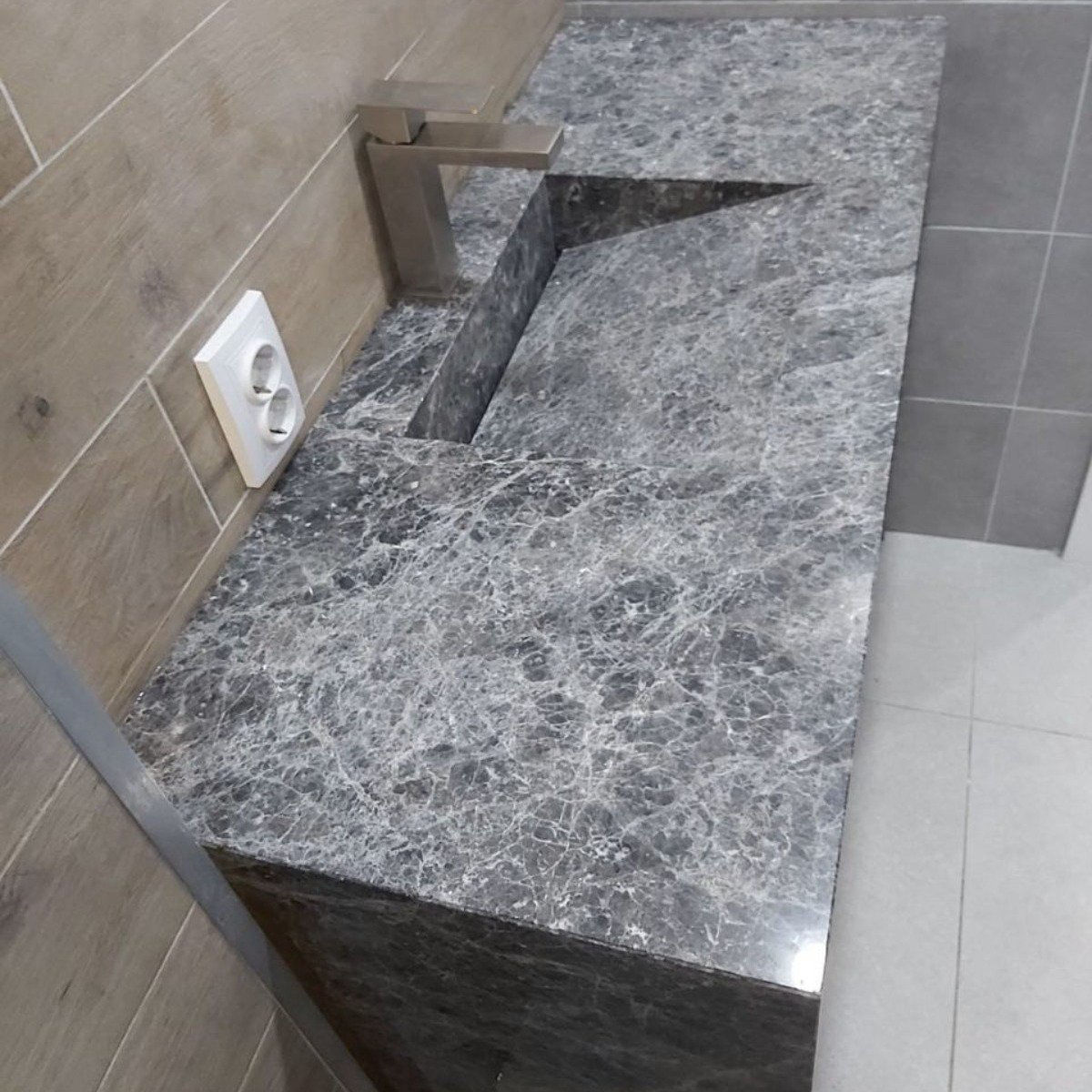 Blatul de baie din Marmură, dă viață spațiului datorită texturii sale bogate în tonalități mixte și imprecise.