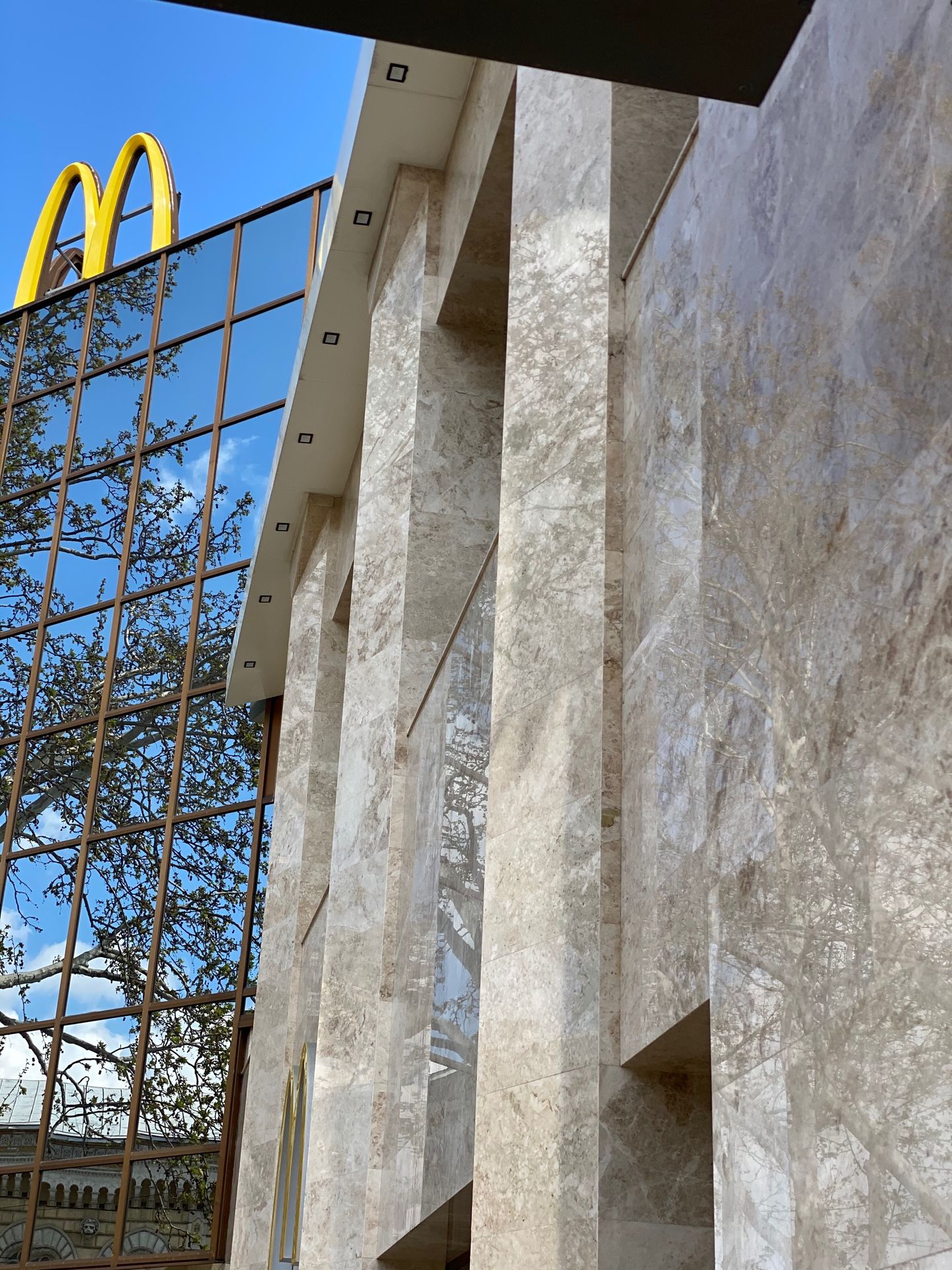 Fatada a fost imbracata cu Marmura Cappuccino, fiind un material versatil care se potriveste oricarui stil adoptat. Un material foarte rezistent, iar costurile de intretinere sunt reduse. Frumusetea obiectului fiind definita inca de la exterior.
