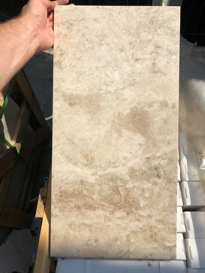 Dimensiunea placilor din Marmura Cappuccino este de 61 x 30.5 x 1.2 cm, fiind usor de montat pe suprafata cu ajutorul unui adeziv.